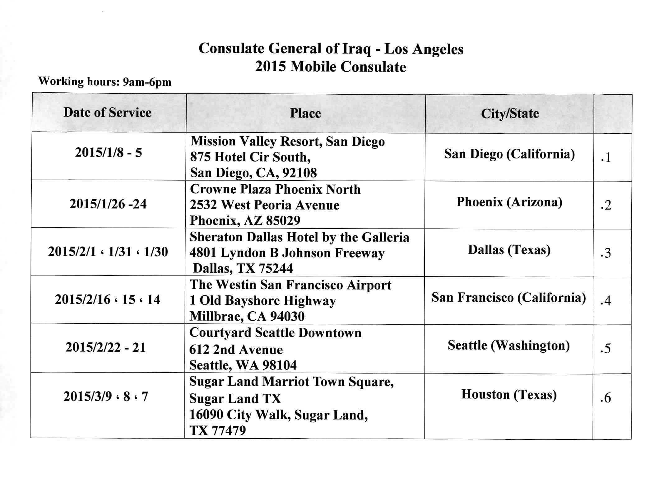 سيقوم كادر القنصلية العامة في لوس انجلس بزيارة الى عدد من الولايات الامريكية لغرض انجاز المعاملات القنصلية الخاصة بكم وحسب العناوين والتواريخ المبينة في الجدول المرفق.