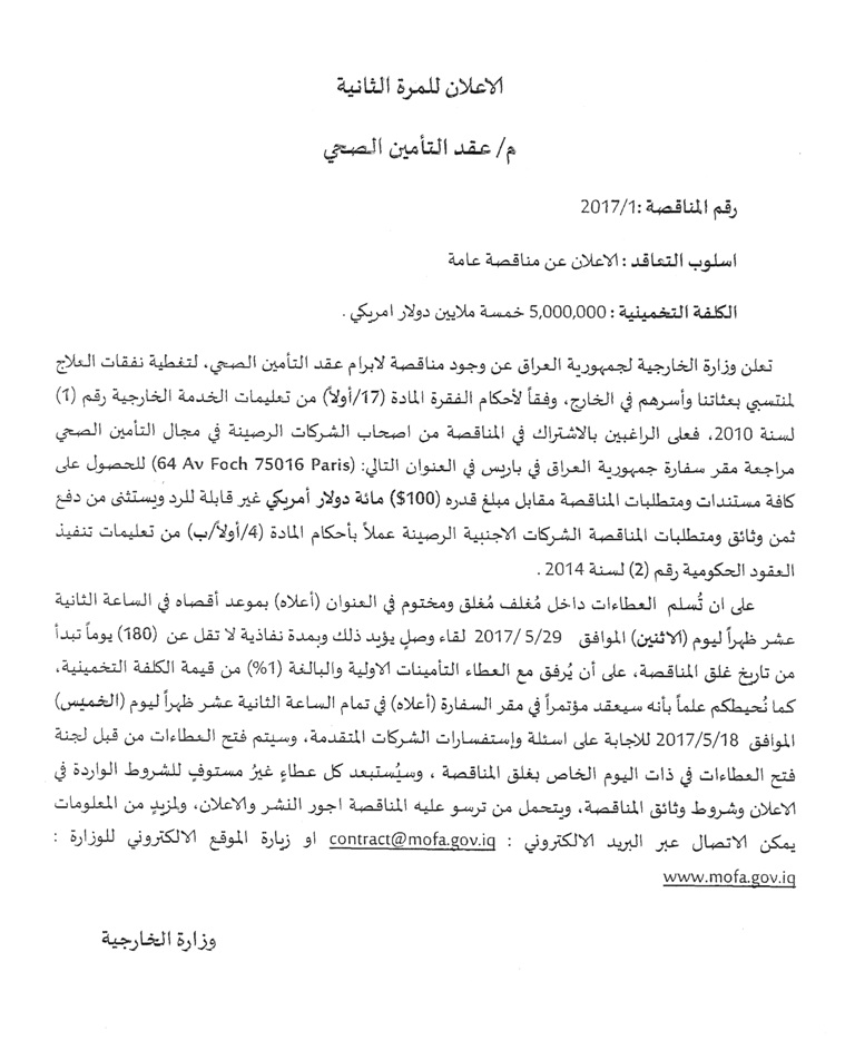 الاعلان عن مناقصة عامة لعقد التأمين الصحي