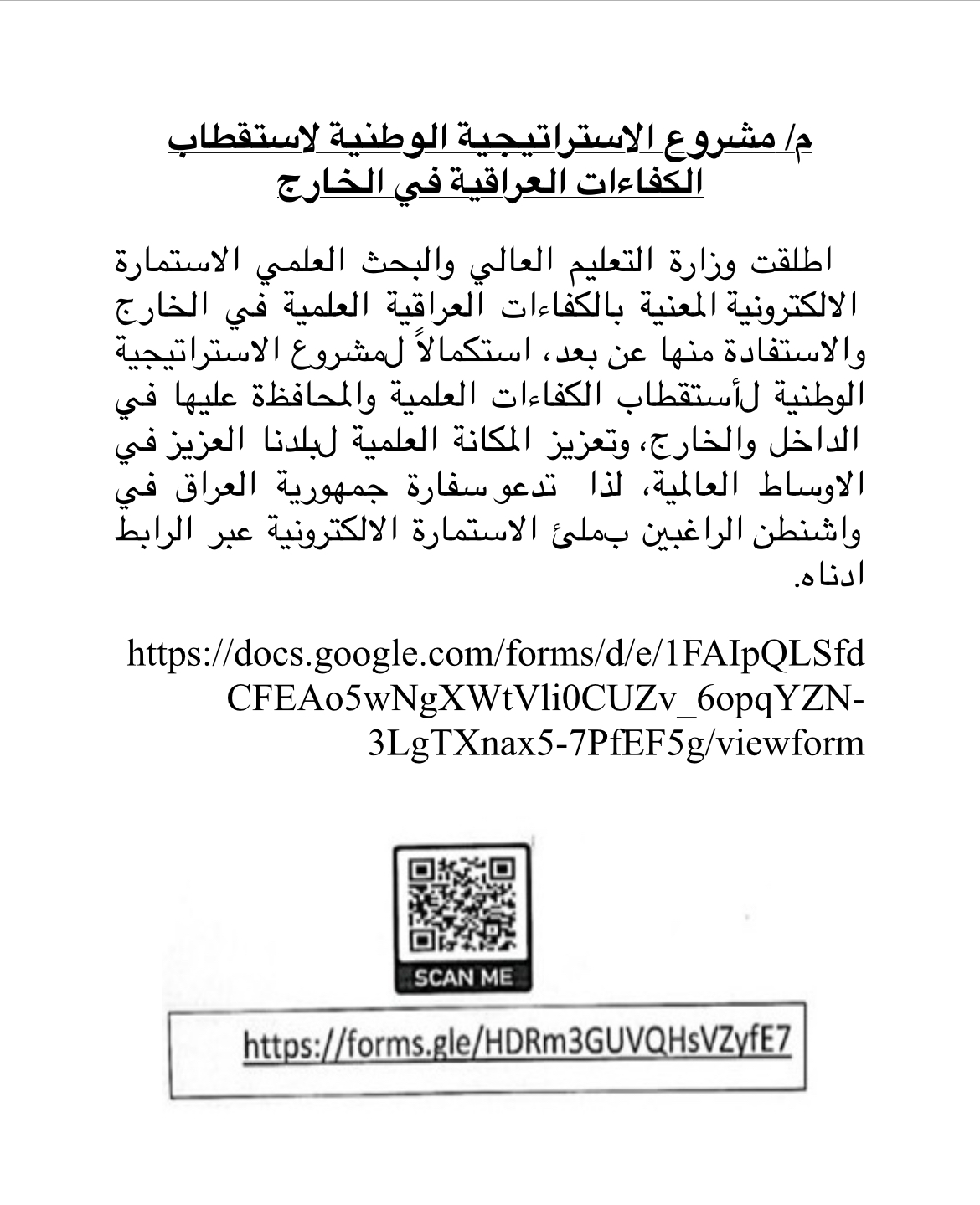 اطلقت وزارة التعليم العالي والبحث العلمي الاستمارة الالكترونية المعنية بالكفاءات العراقية العلمية في الخارج والاستفادة منها عن بعد، استكمالاً لمشروع الاستراتيجية الوطنية لأستقطاب الكفاءات العلمية والمحافظة عليها في الداخل والخارج، وتعزيز المكانة العلمية لبلدنا العزيز في الاوساط العالمية، لذا تدعو سفارة جمهورية العراق في واشنطن الراغبين بملئ الاستمارة الالكترونية عبر الرابط ادناه.