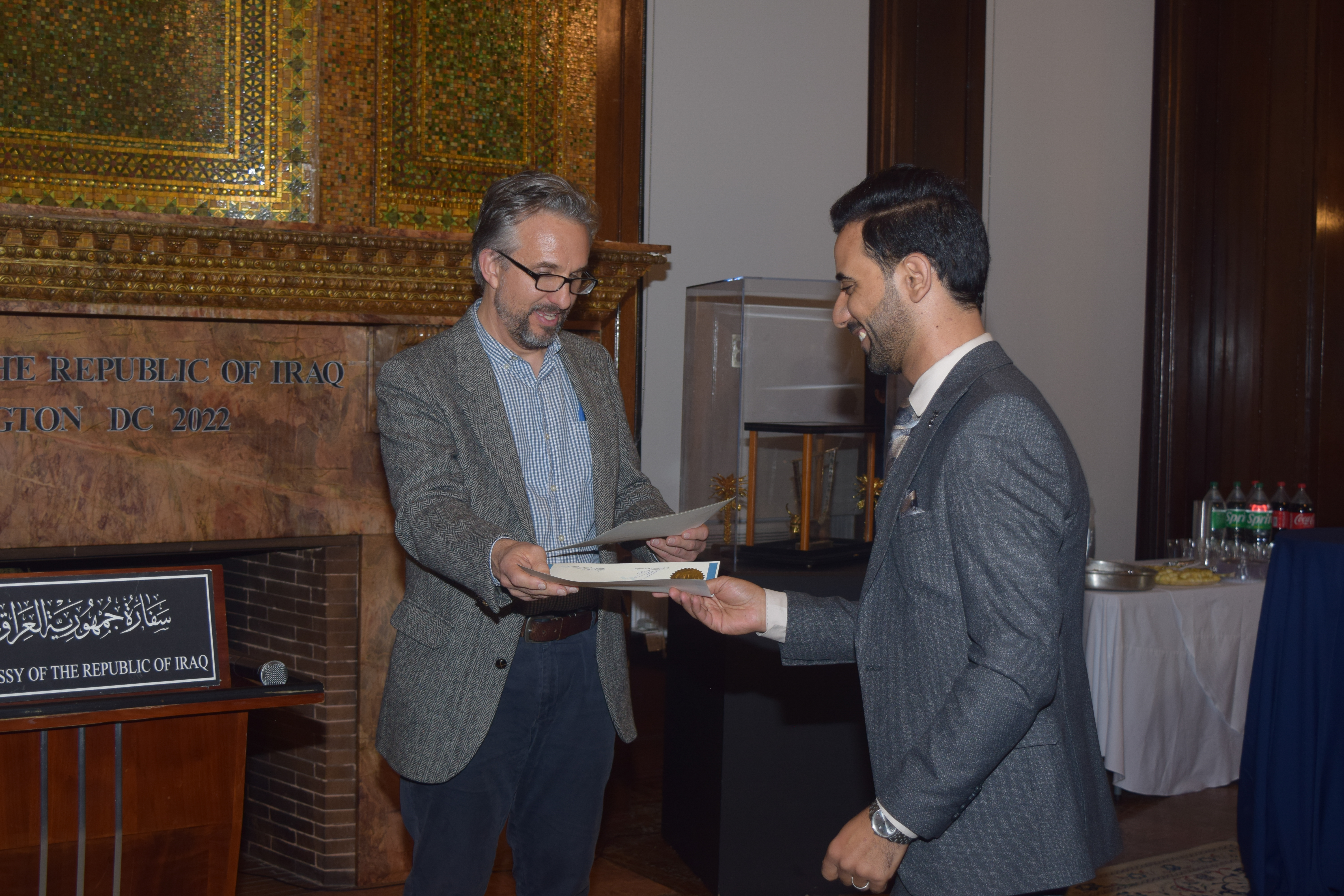 أقامت السفارة العراقية في واشنطن حفل استقبال مسائي لنخبة من الأساتذة والباحثين العراقيين والأجانب الذين شاركوا في مؤتمر معهد الأبحاث الأكاديمية في العراق وهو المؤتمر الذي شاركت فيه السفارة وناقش على مدى يومين (3 – 4 تشرين الثاني) الأبحاث المختلفة التي تجري حول تاريخ العراق وحاضره الثقافي والمعرفي. وجرى خلال الاستقبال تكريم الأستاذ بيتر وين رئيس مركز تاري على جهوده في تعزيز التعاون الأكاديمي بين المؤسسات والباحثين من العراق والولايات المتحدة.