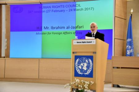 قال وزير الخارجيَّة الدكتور إبراهيم الاشيقر الجعفريّ ونائب رئيس مجلس حقوق الإنسان في كلمة العراق التي القاها يوم 27 شباط 2017 في افتتاح الدورة الرابعة والثلاثين للمجلس والتي تقام أعمالها في مدينة جنيف السويسريّة : " حين قرَّرنا أن نمضي في خطى ثابتة، وواعية نحو دبلوماسيَّة حقوق الإنسان لم ننطلق من فراغ، فتاريخنا مُحفـِّز، ودافع لنا؛ ومن خلاله بنينا نظامنا السياسيَّ، فبعد عام 2003 أبرمنا، وأسَّسنا أطيب، وأفضل العلاقات مع مُختلِف دول العالم في ظلِّ نظام سياسيٍّ ديمقراطيٍّ، ودستور اختاره الشعب العراقيُّ تجسَّدت به مبادئ حقوق الإنسان بأبهى صُوَرها، إذ لم تغِبْ عنه حقوق المُكوِّنات، والانتماءات جميعها".