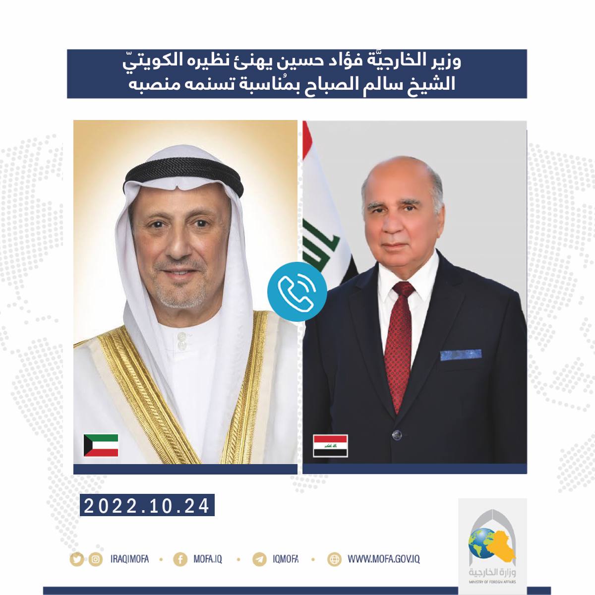 أجرى وزير الخارجيَّة فؤاد حسين، اليوم الإثنين 2022/10/24، إتصالاً هاتفياً مع نظيره الكويتيّ الشيخ سالم عبدالله الجابر الصباح، وأعرب السيّد الوزير عن تهانيه بتسنّم الشيخ سالم الصباح منصب وزير الخارجيَّة في دولة الكويت الشقيقة، مُبدياً تطلّع العراق لأستمرار العلاقات الثنائيَّة المتميزة إلى ما يُلبّي طموح الشعبين الجارين، وأهميّة الارتقاء بآفاق التعاون الثنائيّ بما يعود بالنفع على كلا البلدين.