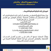 تنويه الى ابناء الجالية العراقية الكريمة تود سفارة جمهورية العراق في واشنطن ان تعلن لابناء الجالية الكرام، انه لاي استفسارات او معاملات قنصلية يمكنكم التواصل مع القسم القنصلي عبر الوسائل الموضحة ، شاكرين تعاونكم معنا. |