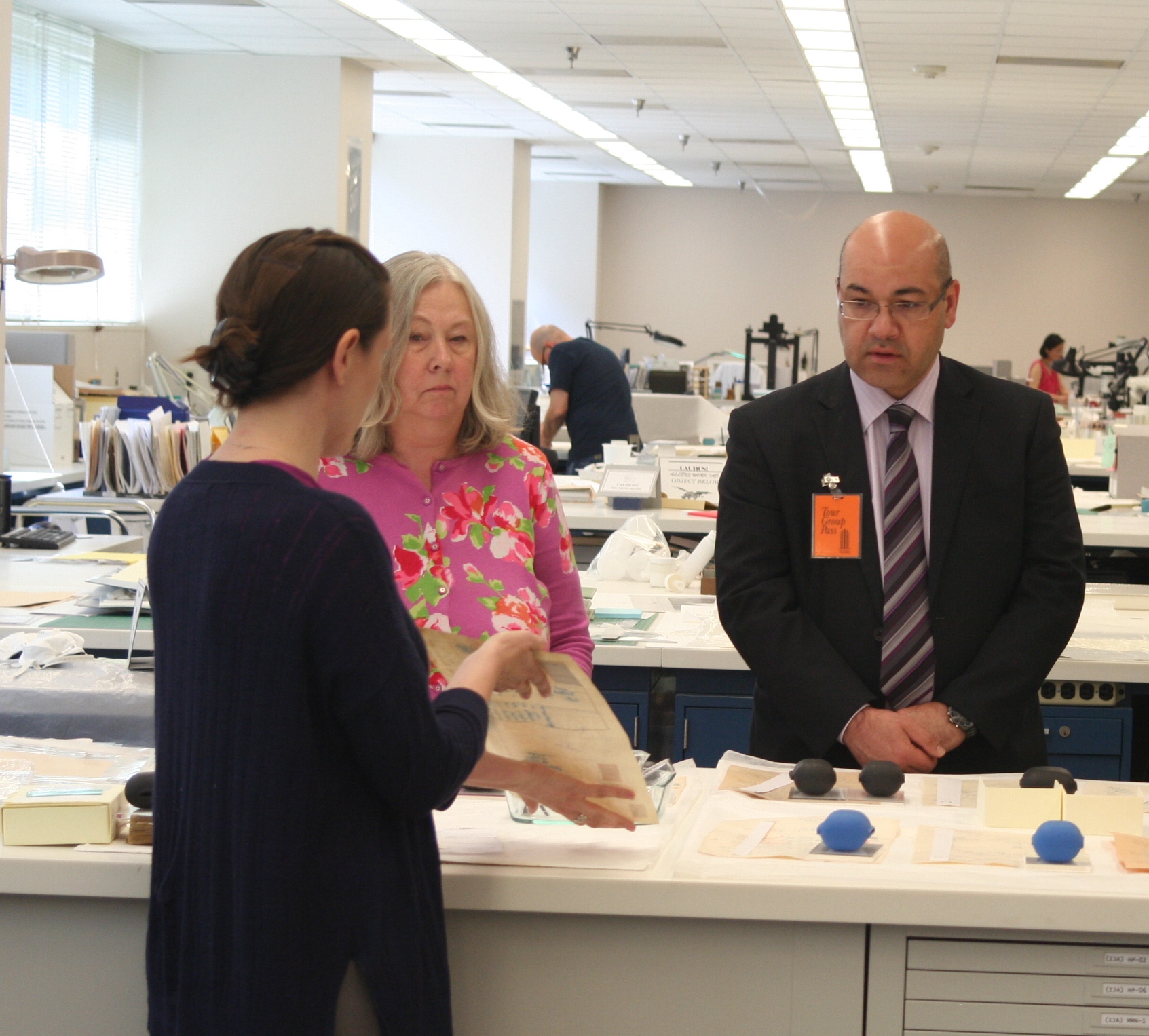 Ambassador Faily was briefed by the head of the Conservation team on the stages of restoration and preservation of the Archive, and the techniques used to digitize the documents and record them electronically. The Ambassador's visit included a tour of the Conservation and Digital Imaging lab and other storage venues.