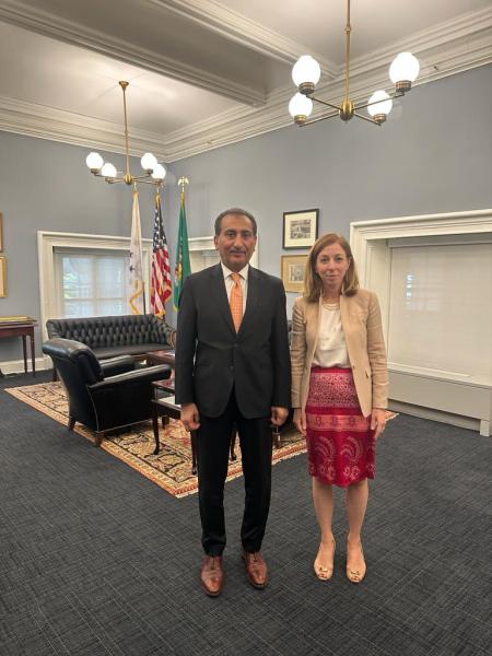 Ambassador Nazar Al Khirullah met on August 31 with Mrs. Elizabeth Rosenberg, the Assistant Secretary for Terrorist Financing and Financial Crimes at the US Department of the Treasury.