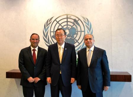 Mohamed Ali Hakim, the Permanent Representative of Iraq to the United Nations and Mansour Al-Otaibi, Permanent Representative of Kuwait to the United Nations, presented a copy of the memorandum of understanding signed between the Foreign Ministries of the two countries to the Secretary General of the United Nations, Ban Ki-moon on June 12, 2013.