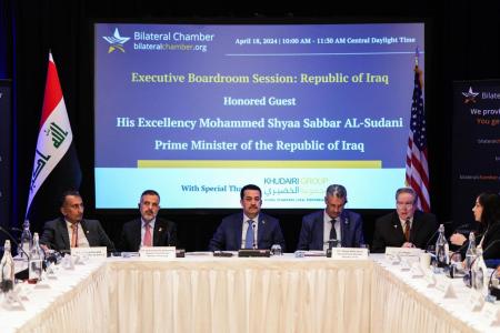 Prime Minister Mohammed S. Al-Sudani met today, Thursday, with major American companies specializing in oil and gas. The meeting was part of a roundtable organized by the Arab-American Chamber of Commerce AACC in Houston, Texas, as part of his official visit to the United States.