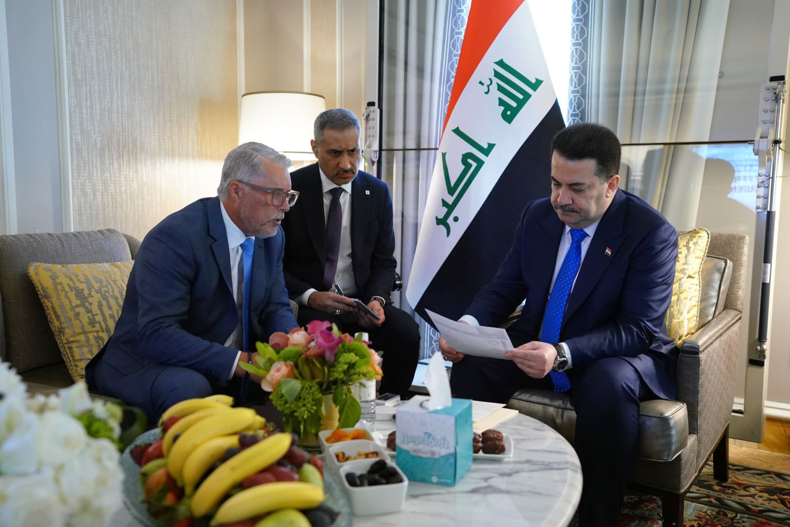 Prime Minister Mohammed S. Al-Sudani welcomed a delegation from Stellar Energy, led by CEO Mr. Peter Gibson, at the Prime Minister`s residence in Washington, D.C. this Tuesday. The meeting focused on cooperation mechanisms with Stellar Energy in the electricity sector and reviewed the progress of their ongoing projects in Iraq.