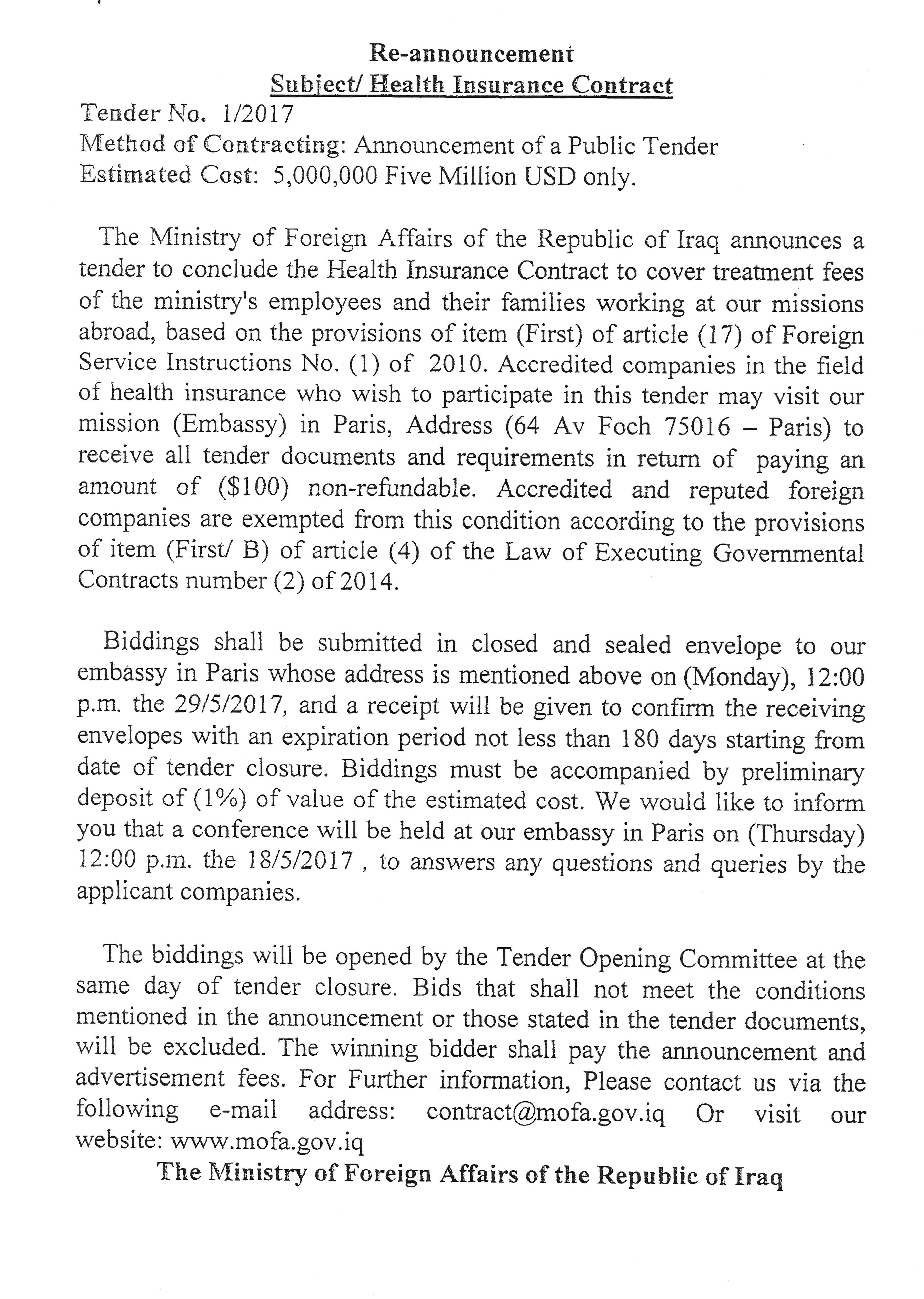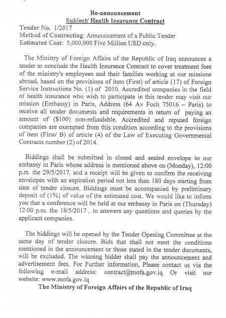 Re-Announcement: Health Insurance Contract - Public Tender
