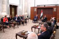 The President Affirms Iraq's Supportive Stance for the Palestinian PeoplePresident Barham Salih received the Palestinian Prime Minister Dr. Mohammad Shtayyeh and his accompanying delegation, at the Presidential Office in Baghdad on Tuesday, July 16, 2019. During the meeting, they conferred about the enhancement of bilateral relations and the development of prospects for cooperation between the two countries in a way that serves the common interests. His Excellency emphasized Iraq's stance in support for the brotherly Palestinian people to ensure a just and comprehensive solution to the Palestinian cause. |