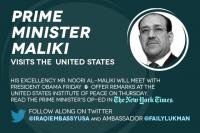 Prime Minister Maliki Arrives in the United StatesPrime Minister H.E. Mr. Noori al-Maliki has arrived in the United States, where he will meet with President Obama at the White House and other officials in Washington to discuss the importance of the U.S.-Iraq relationship under the SFA; and the current challenges facing Iraq and the region. |